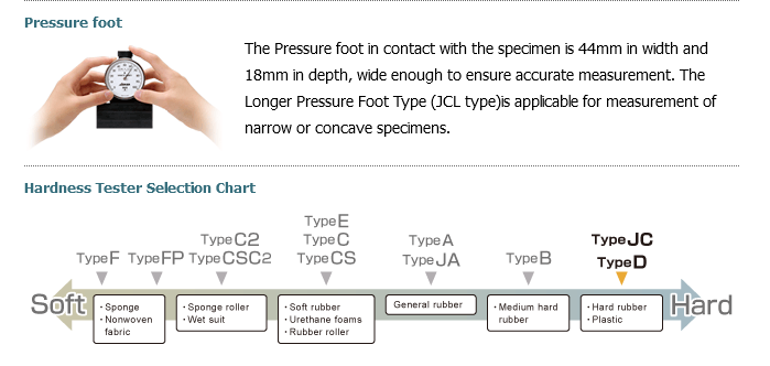 For hard specimens for which Type A Durometer readings indicate more than 90 points, measurements should be undertaken using the Type D Durometer (ASKER D type). However, for soft specimens with measurements of less than 20 points, the ASKER C type or Type E Durometer (ASKER E type) should be used. The most important consideration in using durometers is to select the correct type for purposes of measurement according to the specimen.