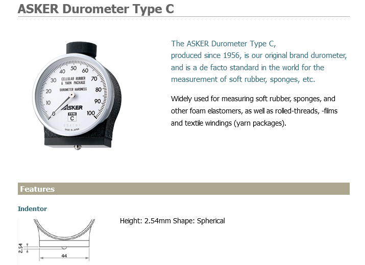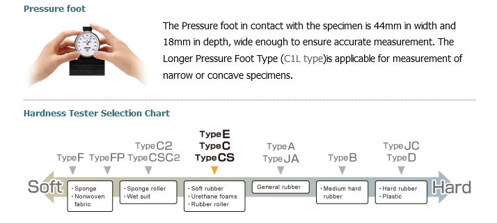 For hard specimens for which Type A Durometer readings indicate more than 90 points, measurements should be undertaken using the Type D Durometer (ASKER D type). However, for soft specimens with measurements of less than 20 points, the ASKER C type or Type E Durometer (ASKER E type) should be used. The most important consideration in using durometers is to select the correct type for purposes of measurement according to the specimen.